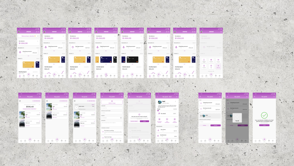 What is the challenge? «As UX/UI, we need you to create the Dashboard and a New goal flow in App mobile version, taking into account the UX study and conveying the client’s values». They give us all the research part done, as well as the colours we have to use to design the app.